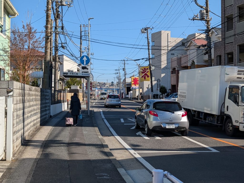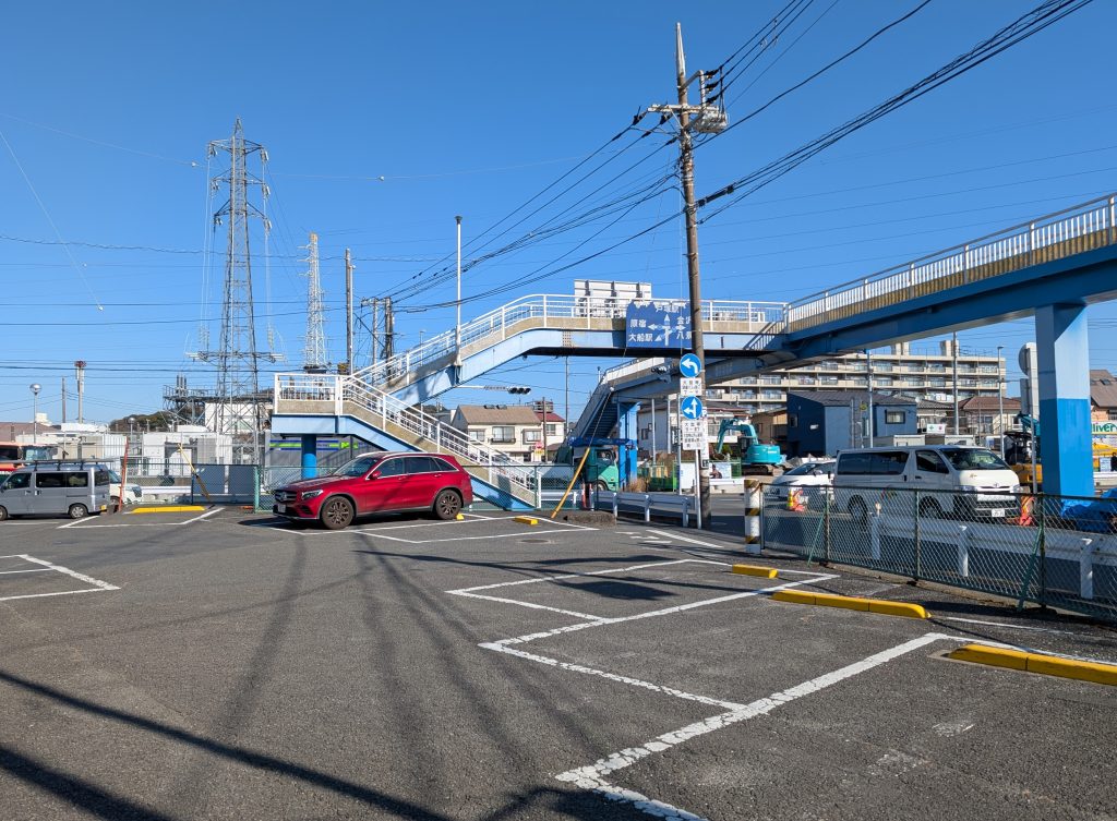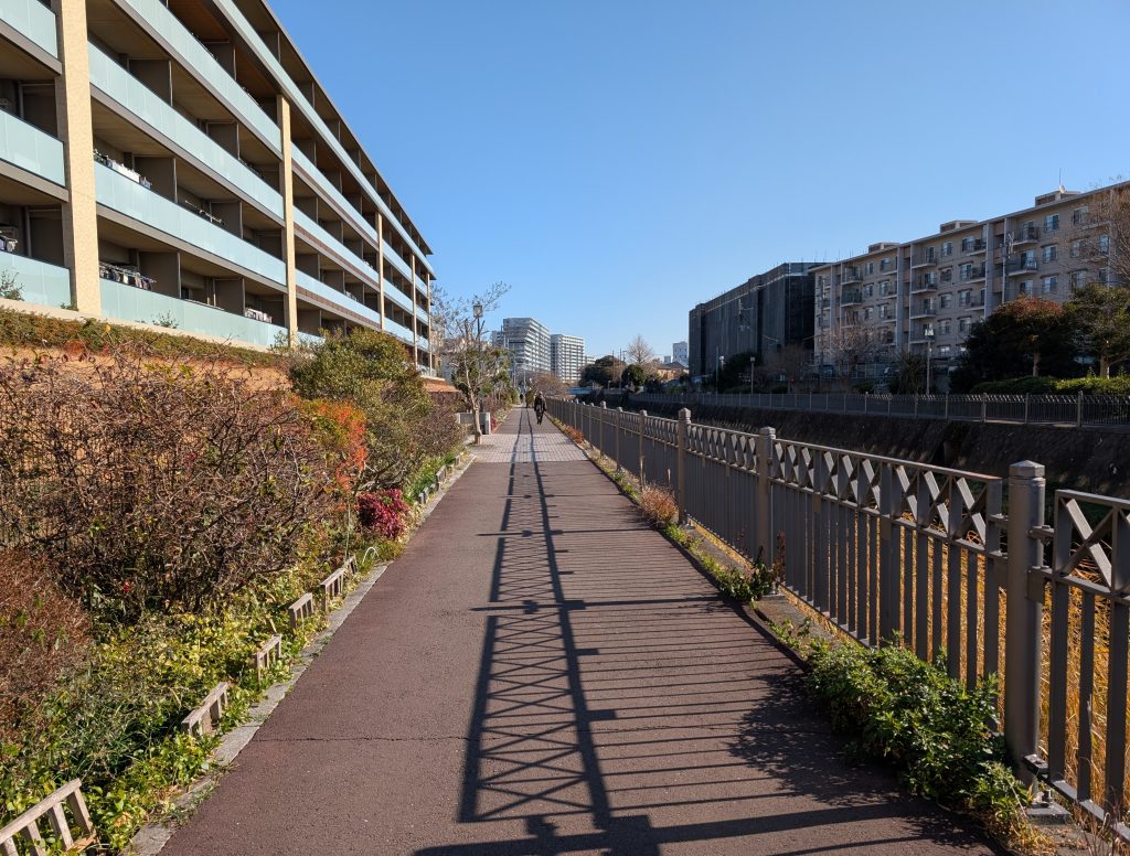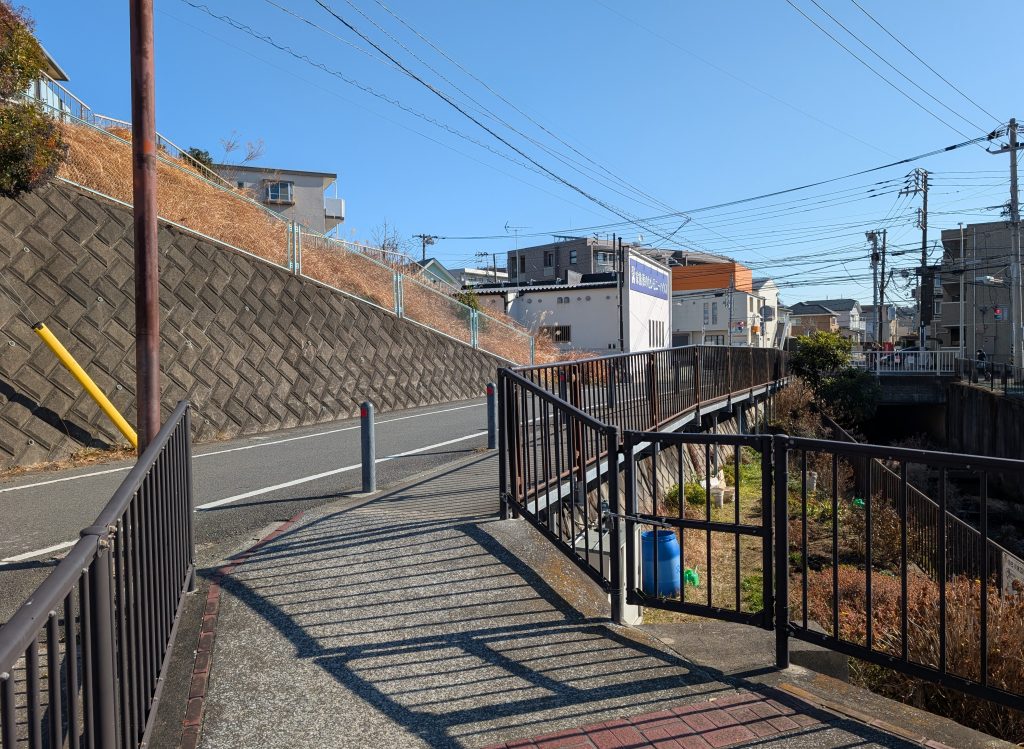 いたち川プロムナードに向かって、歩道橋を渡ります。