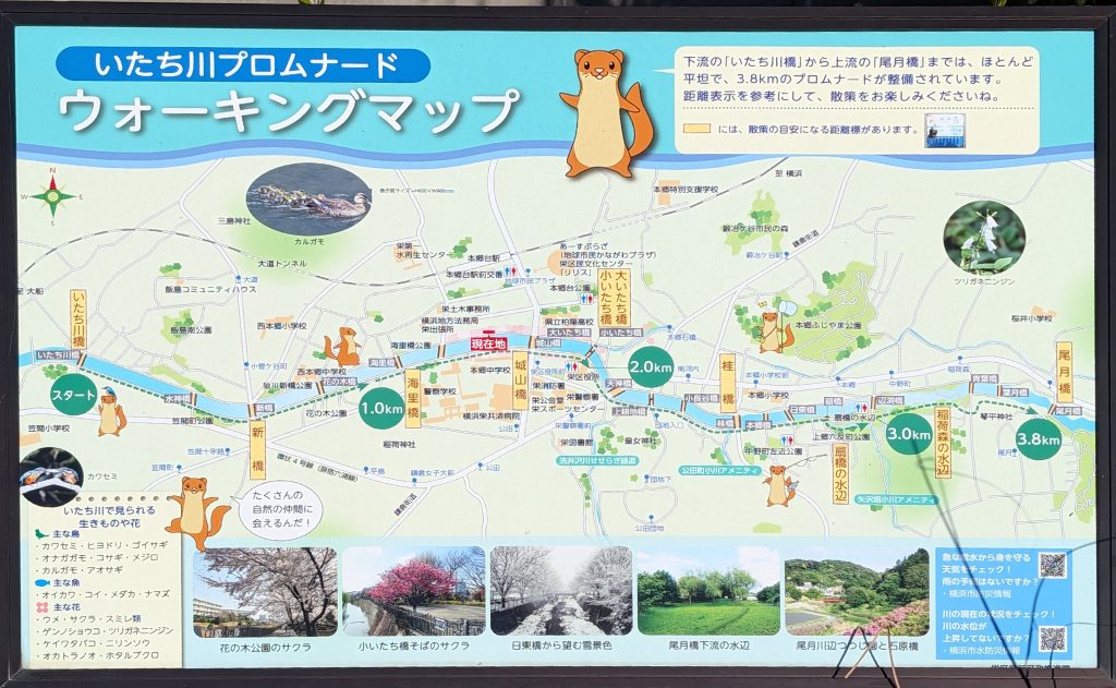 大船駅をスタートして、いたち川プロムナードで四季を感じながら上大岡までの9kmのコース。いたち川プロムナードではカモ、サギなどの野鳥もたくさん見られます。運が良ければカワセミを見ることも!(大きな望遠レンズのカメラを構えた人たちが目印)