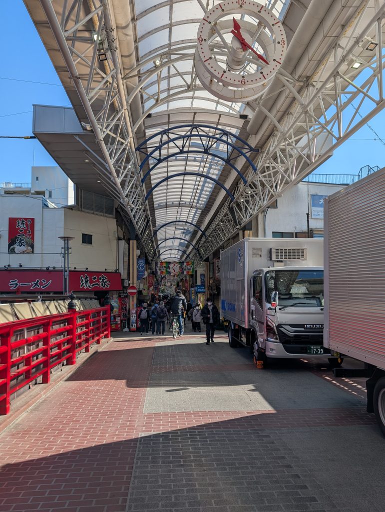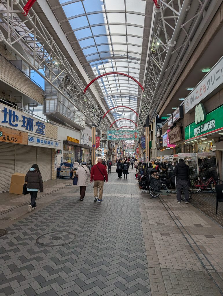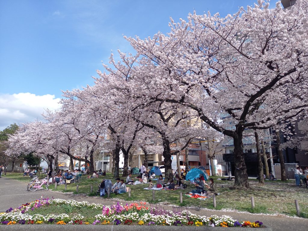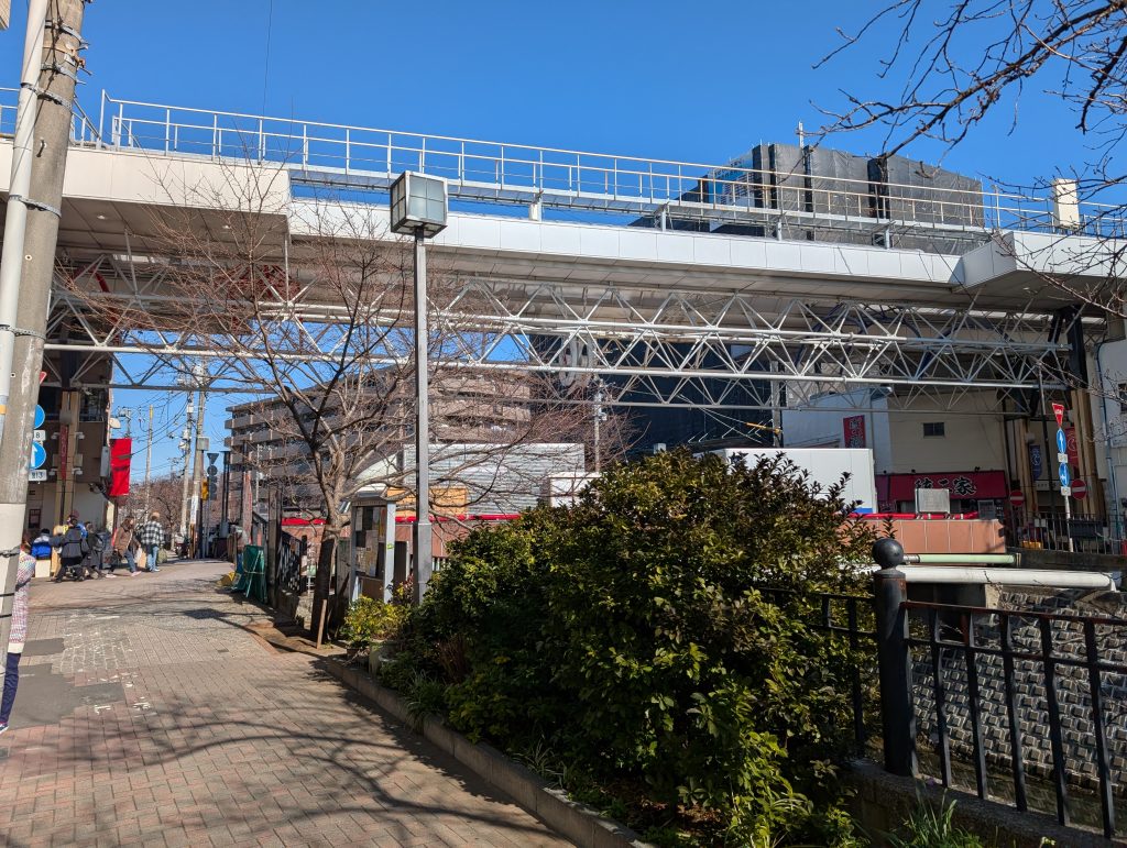 商店街には総菜を販売する店舗も多数あり、川沿いにはベンチもあるので、お花見の時期はたくさんの人が集まります。
