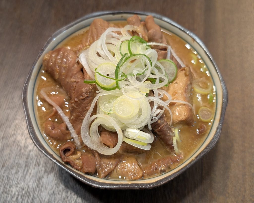 濃い味でご飯に合うもつ煮!柔らかくて、本当に美味しいです。やっぱりビール、焼酎と一緒に!という方は、持ち帰りで自宅でというのもありです。持ち帰りはネギも付いており、一人では少し多いくらいのボリューム(500g強)です。