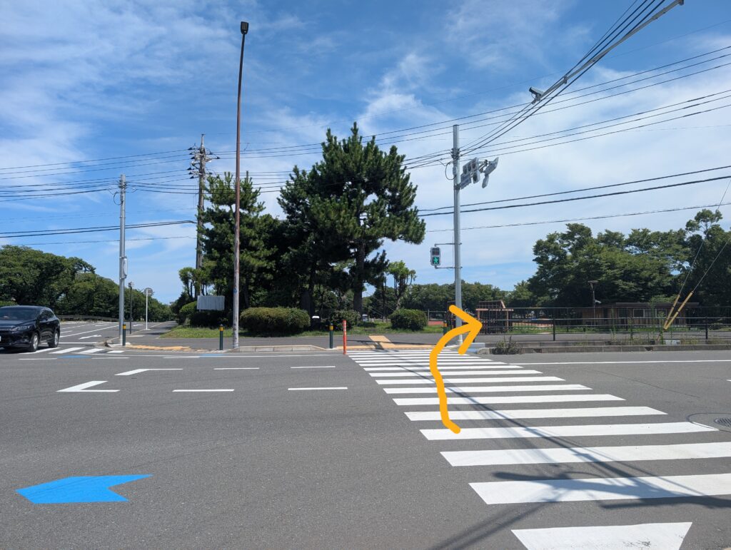 横断歩道を渡り、右手に歩道を進みます。