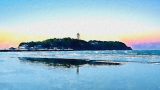 静かに海に浮かぶ江ノ島と輝く初日の出は感動的な光景です。
