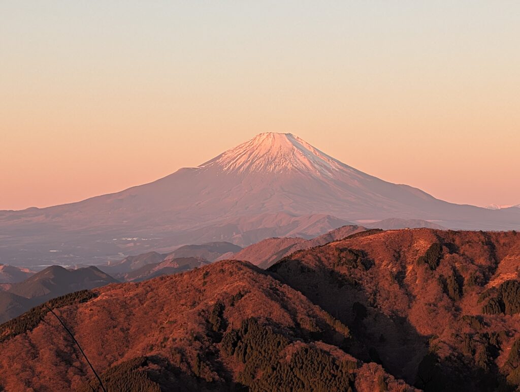 朝焼けに赤く輝く富士山も最高のご褒美です。
