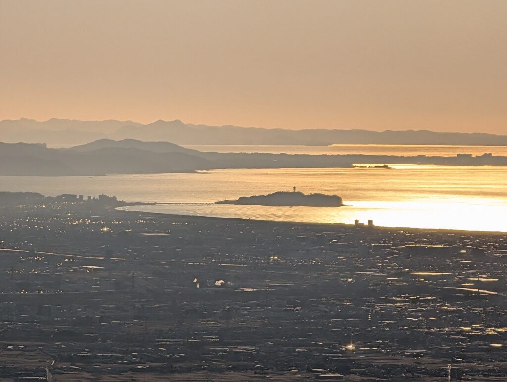 少し太陽が上がってきて明るくなり始めたタイミングで改めて江ノ島方面を眺めると、朝日に輝く海に浮かぶ江ノ島!息をのむ感動的な景色が広がります。感動と興奮で涙が出そうな光景でした。